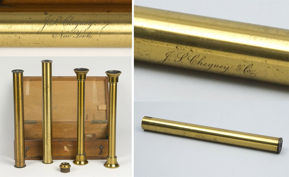 Saccharometer tubes signed by Cheyney. It is probable that he imported all of these instruments, then attached his name to them. On the left, four tubes, one of which is signed “J.S. Cheyney, New York”, dating it to 1876-1877. That tube is also signed by the maker, Jules Duboscq, of Paris. On the right, a tube signed “J.S. Cheyney & Co.”, dating it to between 1880 and ca. 1900. Images adapted for nonprofit, educational purposes from the Harvard University Collection of Scientific Instruments, http://waywiser.fas.harvard.edu/people/2680 and http://waywiser.fas.harvard.edu/objects/11974.