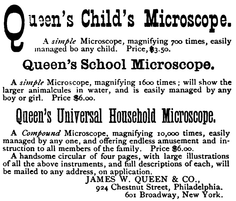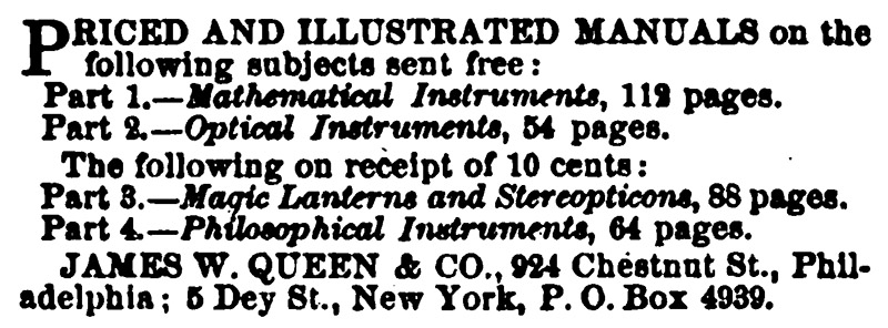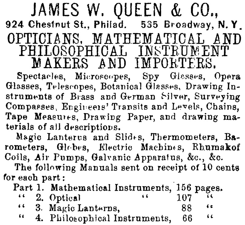 Scientific American (1870) “James W. Queen & Co., the well-known mathematical and optical instrument makers, of Philadelphia, have opened a branch of their establishment in this city, at No. 5 Dey St. Their advertisement appears in our advertising columns. We can recommend this firm to such of our readers as desire to purchase articles in their line or trade”, September issue, page 149