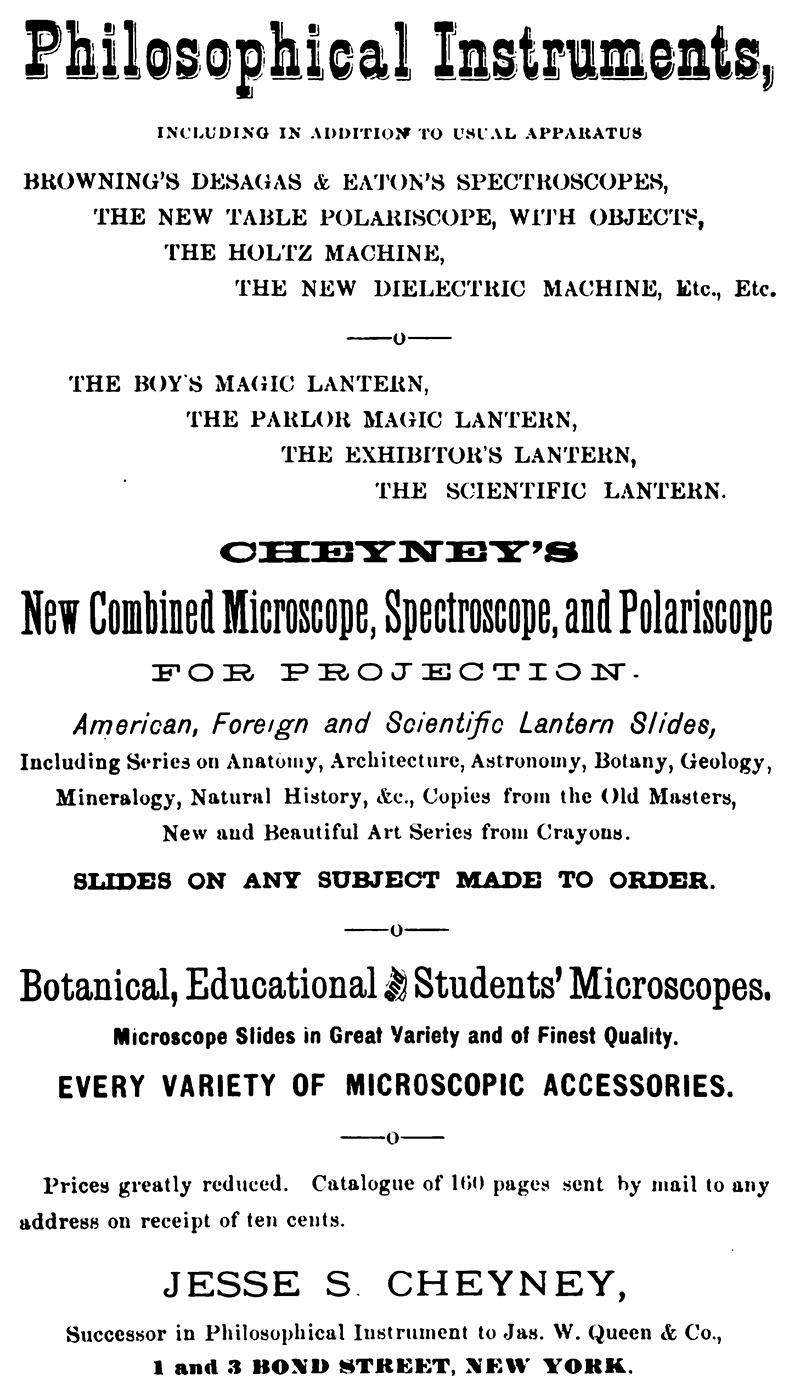 As an educator with experience in using lantern projectors and other technical devices as teaching tools, J.S. Cheyney joined with Samuel L. Fox and William H. Walmsley in 1870 to buy out James W. Queen’s Philadelphia scientific supply business. They named their partnership J.W. Queen & Company. Cheyney took charge of the philosophical instruments department, that is, magic lanterns, barometers, thermometers, etc. One of the new corporation’s first steps was to open a branch in New York City, which was managed by Cheyney. In early 1876, he quit the partnership, and opened his own New York shop. After that failed, in 1877, Cheyney moved back to Philadelphia and started a business that made and sold microscope slides, microscopes, photographic supplies, and other, similar goods.