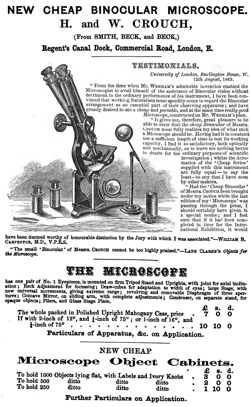 A July, 1864 advertisement for H. and W. Crouch’s inexpensive binocular microscope.