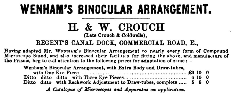 September, 1863 advertisement, illustrating Crouch's binocular microscope. From “The Medical Times and Gazette”.