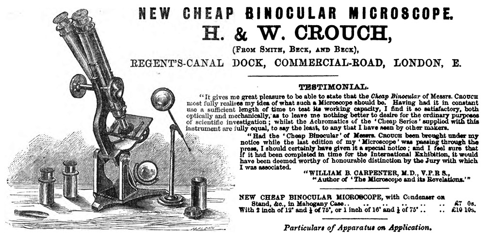 Advertisements for the Crouches low-priced binocular microscopes include testimonials from celebrity microscopists such as William B. Carpenter and Louisa Lane Clark. Clark’s testimonial was dated November, 1862, consistent with Teasdale’s later recollection. She included a description and picture of a later version of Crouch’s binocular in her classic book, Objects for the Microscope.