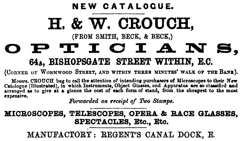 Advertisements as early as September, 1864, indicated a move to 64A Bishopsgate Street (Figures 4 and 5). For several years afterwards, the Crouches retained the Regent’s Canal Docks location as their factory, although not as a retail location. Of known microscopes, number 170 is engraved with the Regent’s Canal Docks address, and 176 has the Bishopsgate Street address.