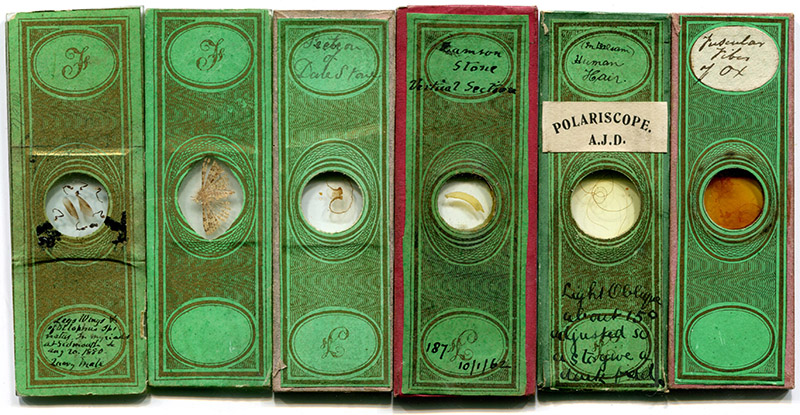 Microscope slides with “F” paper covers. These examples show a wide variety of techniques - the two on the left do not have back or side papers, the others are wrapped using several different methods - suggesting that they were made by many different people. The slide on the right was made by Birmingham slide-maker Henry Webb. It is likely that the papers, but not the slides, were sold by one of the Field businesses.