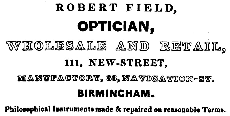 The Picture of Birmingham (1837) “Opticians (Working), and manufacturers of spectacles, optical and mathematical instruments: Field Robert, 111, New Street, and 33, Navigation street”, Third edition, James Drake, Birmingham, page 133