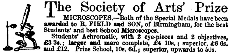A critic from the Microscopical Society of London complained, “Now we think most people would gather from this that Mr. Baker gained the prize of the Society of Arts for his microscopes, and they will perhaps be astonished when we tell them he did not do so. The microscope to which the Society of Arts gave their prize medal was one manufactured by Mr. Field, of Birmingham, to whom the public is indebted for this cheap and efficient instrument. We know that Mr. Baker may reply that his microscopes are of the same pattern as the one which obtained the Society of Arts' prize, but we hardly think that this justifies him and his friends in speaking of any instrument he makes as the ‘Society of Arts Microscope’, much less in claiming for him the award of a medal which was given to another microscope-maker. We do not say this to depreciate Mr. Baker's microscopes, - for aught we know they may be better than Mr. Field's, - but we think that the public ought, in fairness, to know who is really the inventor and original maker of the ‘Society of Arts Microscopes’." Nonetheless, Clarke’s book enjoyed a wider, and more prolonged, readership than did the Transactions of the Microscopical Society of London, and can only have hurt Field’s sales.