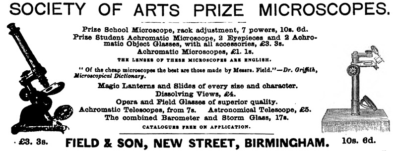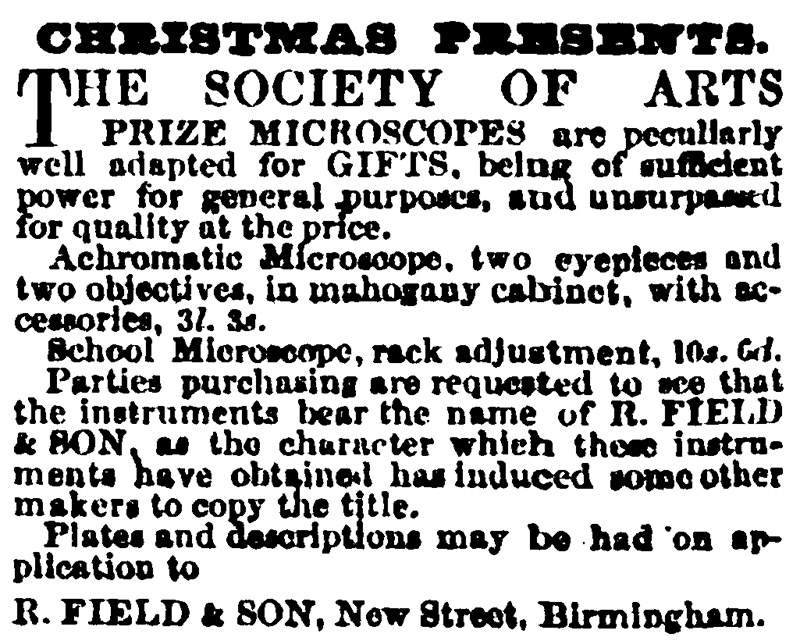 An 1858 advertisement, cautioning customers to look for the Field name on “Society of Arts” microscopes.