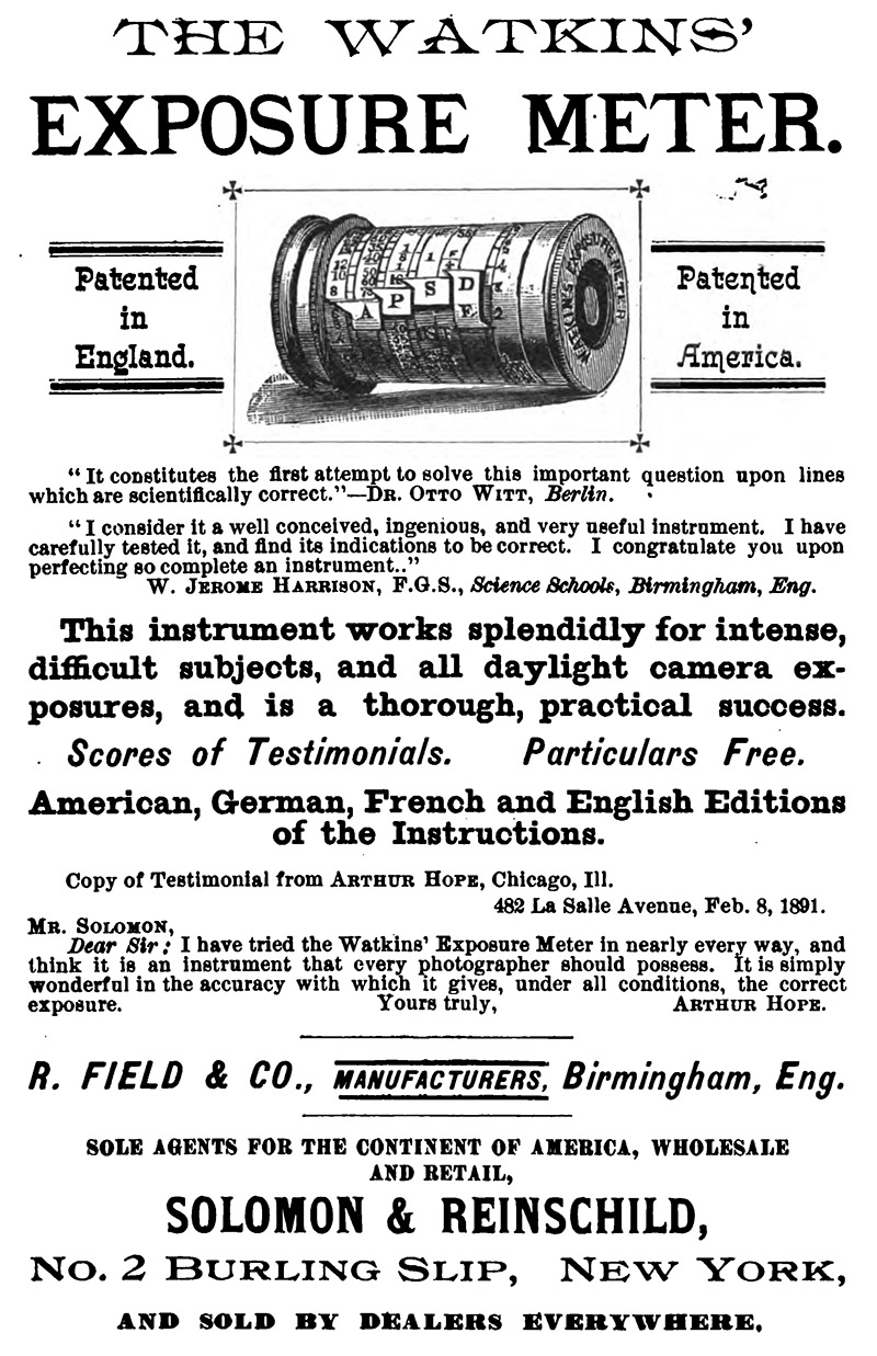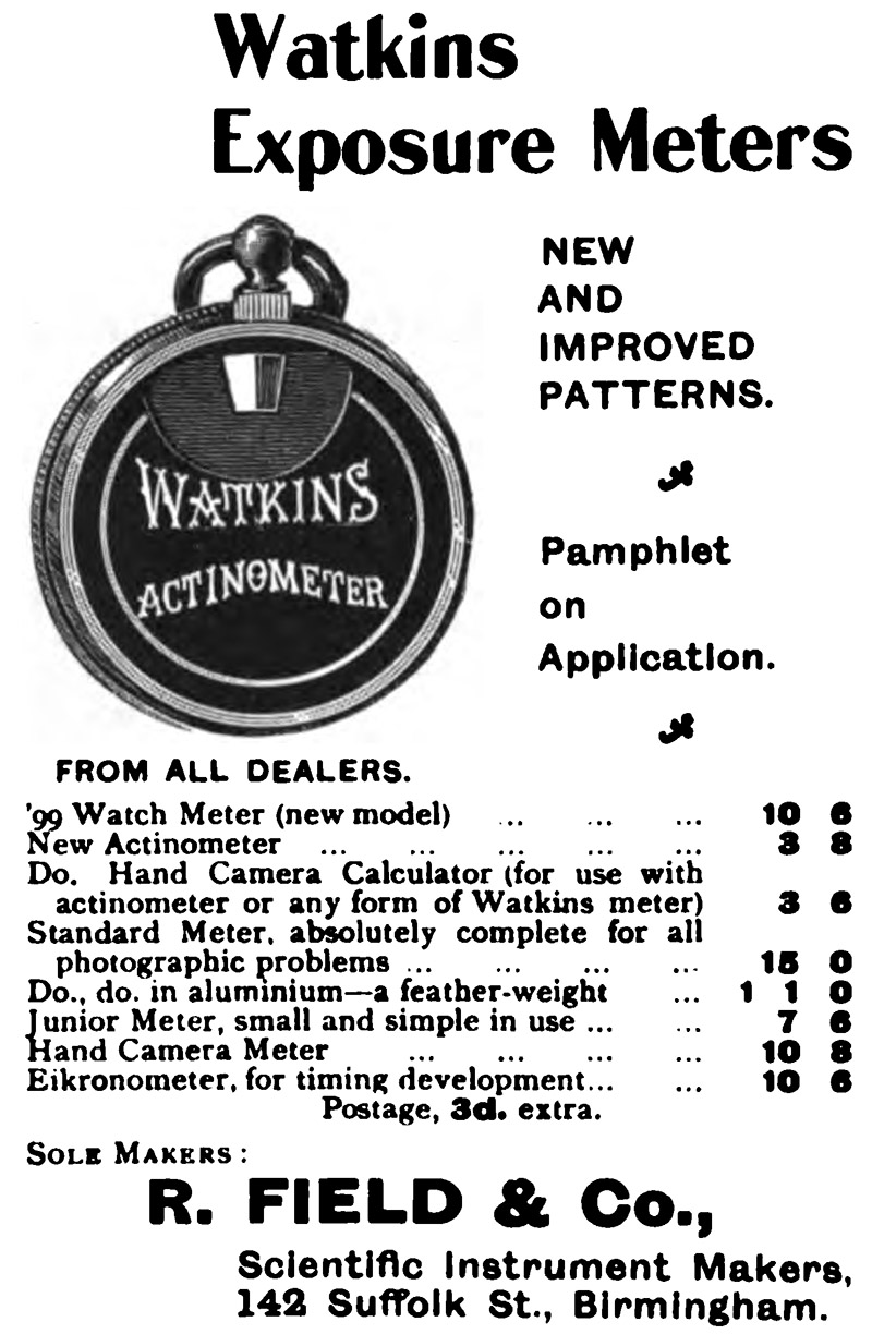 The Photographic Dealer (1899) “R. Field & Co., 142 Suffolk Street, Birmingham, send a list giving prices of Watkins' exposure meters, the merits of which are known to every photographer; the list, besides giving prices, gives also the full working instructions of the meters”, Vol. 6, page 88