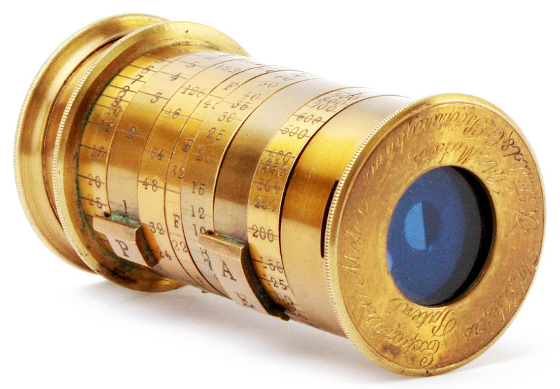 A Watkins exposure meter, engraved “Sole Maker R. Field & Co. Birmingham”. Adapted for nonprofit, educational purposes from an internet auction site.