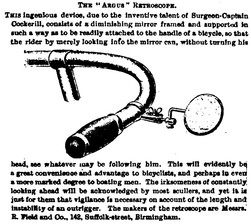 An 1897 advertisement for a bicycle rear-view mirror, made by R. Field and Co.