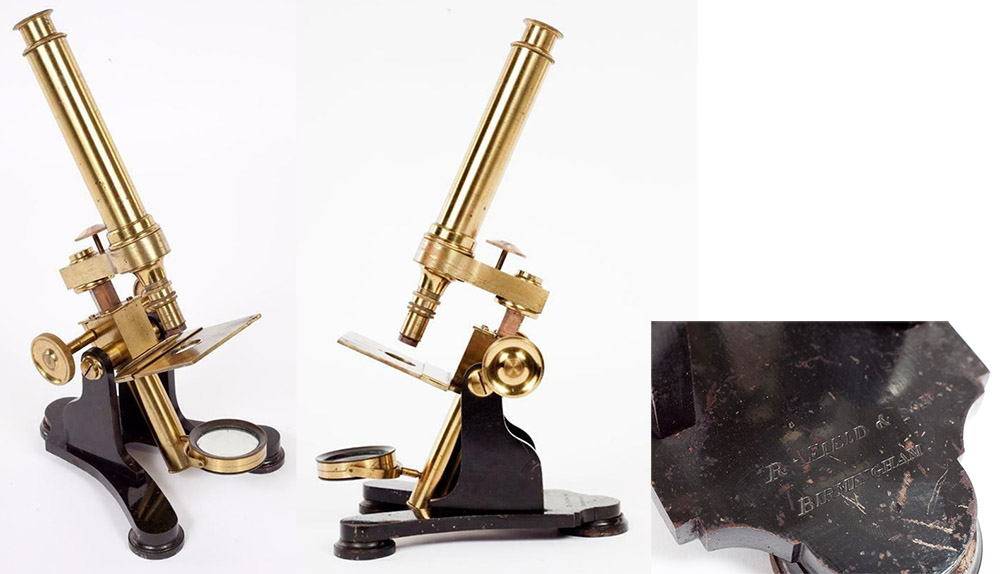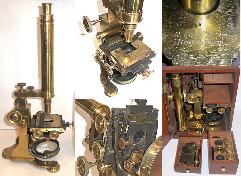 A bar-limb compound microscope, by R. Field & Son. Circa 1860s. Adapted for nonprofit, educational purposes from an internet auction site.