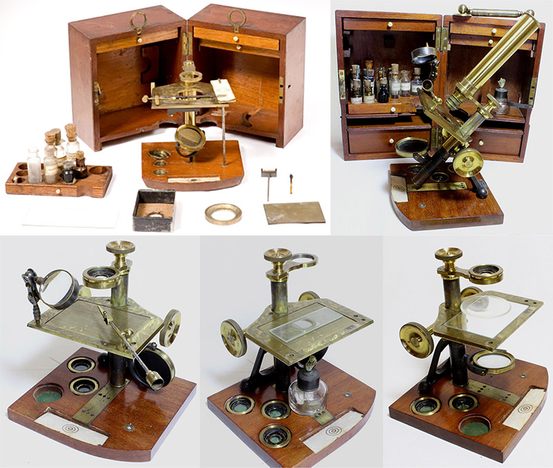 A more complex version of Field & Son's bar-limb compound microscope. Circa 1860s. Adapted for nonprofit, educational purposes from an internet auction site.