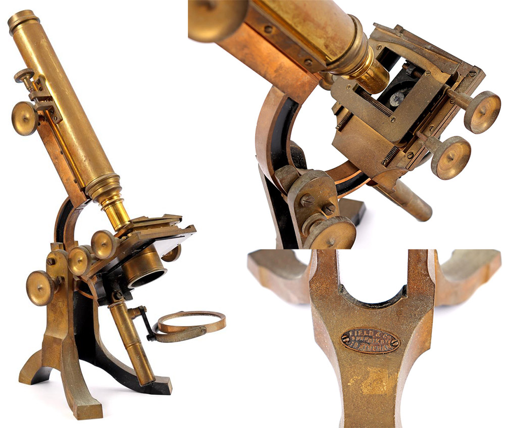 Circa 1880 Field and Co. microscope with a "Wale" limb. George Wale developed this form of stand in 1879. Adapted for nonprofit, educational purposes from an internet auction site.
