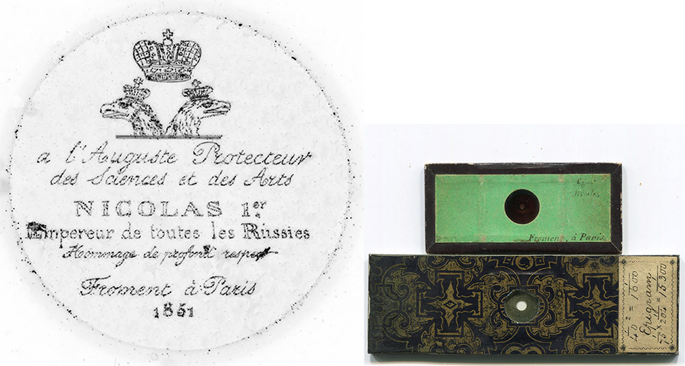 Microengravings by Froment are rarely found in collections or at auction. This may be due to their not being a major product of a skilled mechanical engineer who manufactured precise instruments. Or, it may be a matter of loss through the years or lack of recognition. I acquired the Froment slide shown in Figure 1 in a large mix of slides and microscope apparatus from France, of which the seller did not recognize anything special about the small green-and-black slide. May we all be so fortunate!
