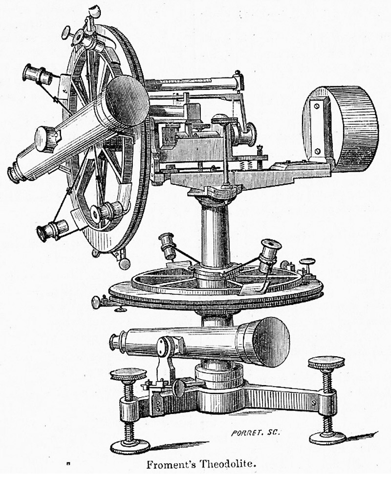 An illustration of a theodolite that was displayed by Froment at the 1862 London International Exhibition.