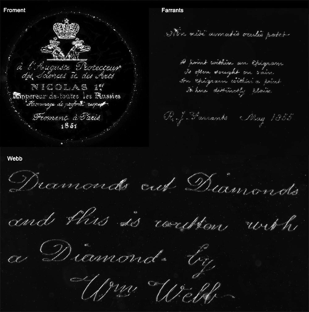 Comparisons of microengravings by Gustave Froment, Robert Farrants, and William Webb. All were photographed using the same microscope, 10x objective lens, and camera, using phase contrast lighting. The composite image was produced with all images having the same relative size. Large dust motes were erased digitally.