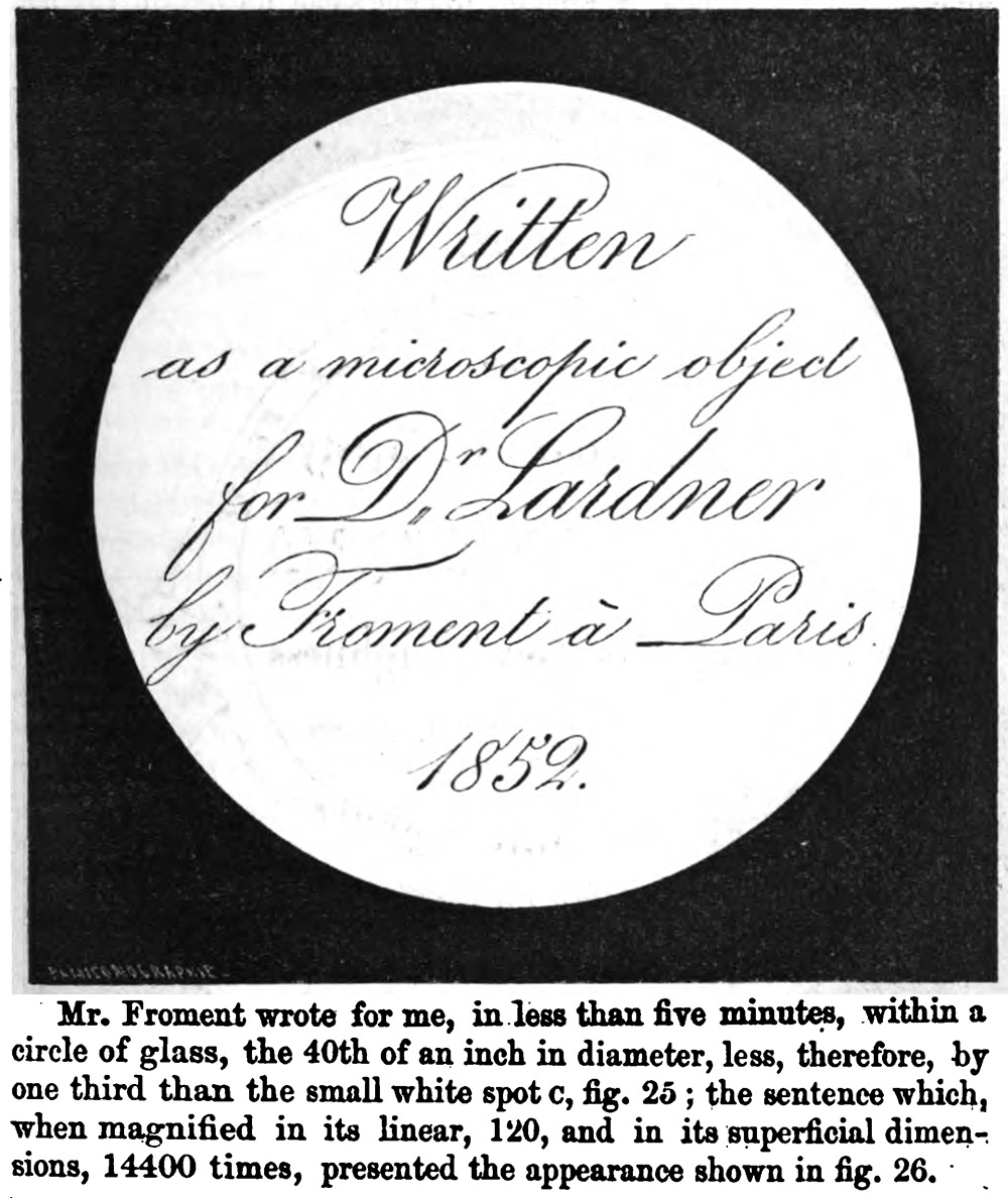 Dionysius Lardner wrote in 1856 of a visit to Froment, which included a personalized gift, “I now come to notice a sort of microscopic engraving, which, though it is at once the most curious and difficult, has not, so far as I am informed, had as yet any directly useful application. Regarded, however, as an example of mechanical ingenuity and skill, and as an artistic tour de force of the highest order, it is full of interest. However much we may admire the production of the micrometric scales and microscopic test-plates described above, there is nothing in them to excite surprise, save the precision which is combined with such extreme minuteness. To draw a series of parallel lines of regulated length and uniform intervals, is a problem, to the solution of which it is easy to conceive that finely constructed mechanism can be adapted; but when it is proposed to delineate objects and characters, in which no such regularity prevails, and, in tracing which, the point of the graving tool must pursue a course determined by conditions, which obviously cannot be represented by any kind of mechanism, and to accomplish which it must be guided, directly or indirectly, by the hand, a problem of quite another, and far more difficult order, is presented: such, however, is the curious and complicated problem for which Mr. Froment, already named, has found a solution. This eminent artist has succeeded in producing manuscripts and drawings, engraved upon glass, on a scale of minuteness in no degree less surprising, though far more difficult of execution than the test plates of Mr. Nobert. … Mr. Froment wrote for me, in less than five minutes, within a circle of glass, the 40th of an inch in diameter … the sentence which, when magnified in its linear, 120, and in its superficial dimensions, 14400 times, presented the appearance shown in (Figure 6). On the occasion of the Great Exhibition in 1851, the characters and figures shown in (Figure 5) were engraved by Mr. Froment”.