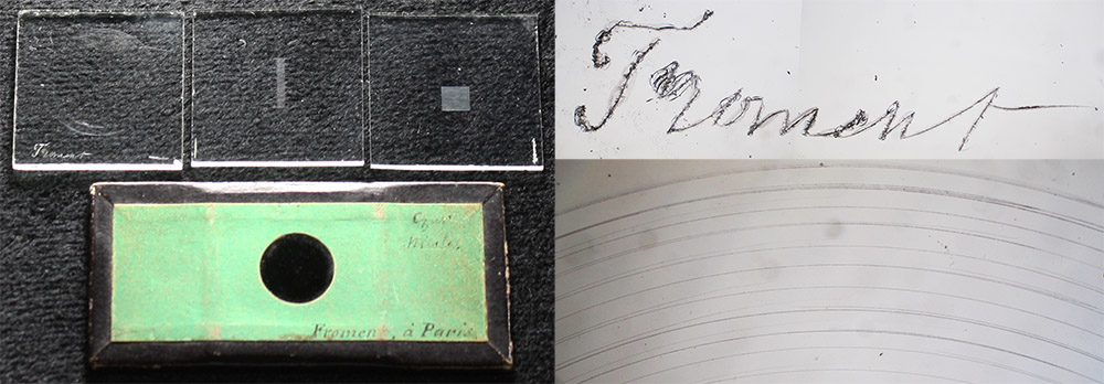 The box of microscope apparatus that included the Froment slide shown in Figure 1 also included several precisely-cut microscopic lines and circles. One of them, a 2cm square of glass with a series of concentric circles, bears Froment’s engraved signature (left image, leftmost slide). Two additional, unsigned glasses with precise grids are also shown. Brightfield photomicrographs of Froment’s signature and the circles are shown to the right, both photographed with a 3.5x objective lens and C-mounted digital camera.