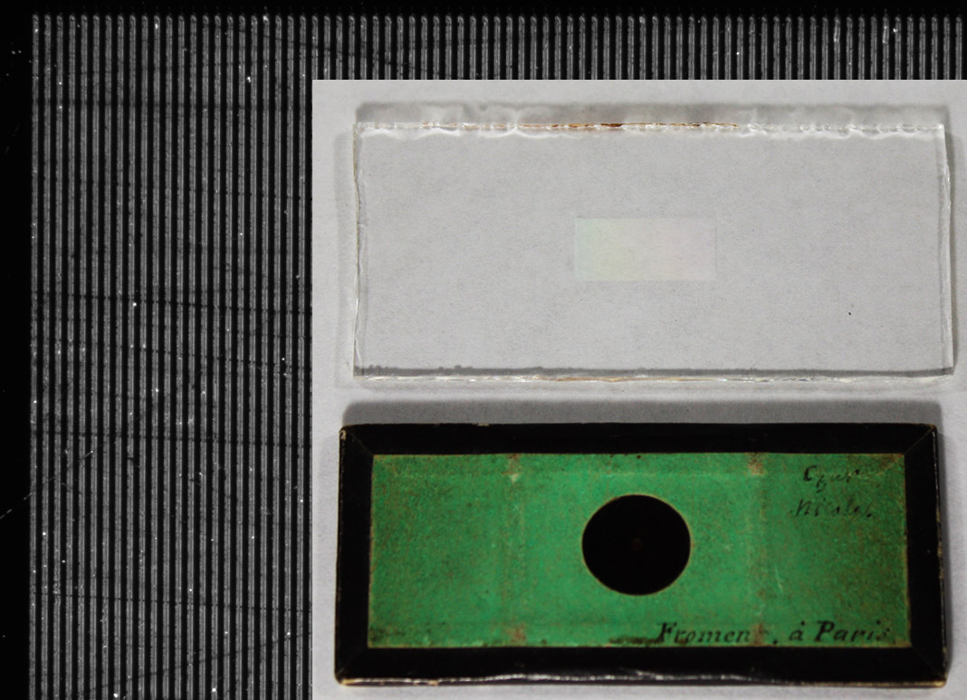 A larger glass slide with a micro-engraved series of lines that accompanied the Froment-signed slides. The set of lines appears as a rainbow-hued rectangle in the inset photograph. Although unsigned, its quality of production and circumstance of discovery suggest that it was produced by Froment. A phase-contrast photomicrograph is shown in the background, photographed with a 10x objective lens and C-mounted digital camera.