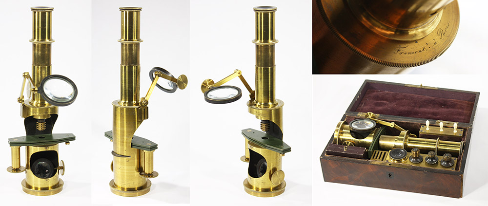 A drum style compound microscope that is engraved with Froment’s name. Two other such microscopes are known to me, suggesting that this was a standard pattern of Froment's. Unique features suggest that either Froment built them in-house or had them custom-made by a wholesale manufacturer.