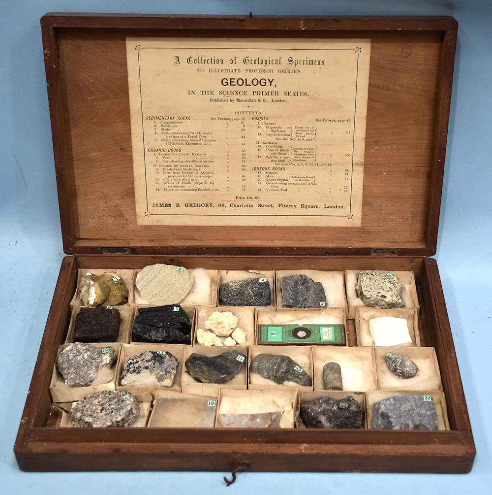 Geikie, Archibald (1910) The Teaching of Geography, third edition, published by Macmillan and Co., London. The rear of the book includes an advertisement for Primer of Geology, which states that a "Box of geological specimens to illustrate Geikie’s Primer Of Geology" was available for 10s. 6d.