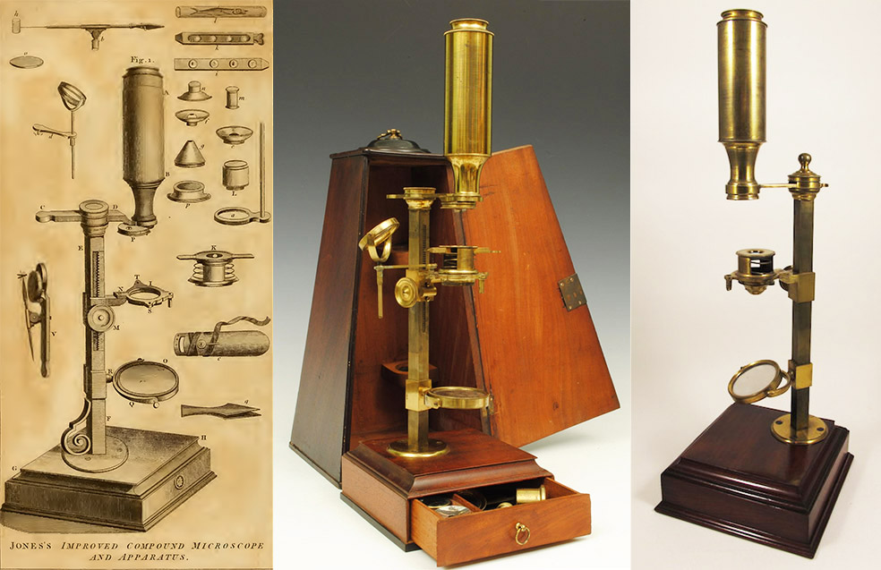 Jones “Improved” microscopes. Left, from their 1798 edition of George Adams Jr.’s “Essays on the Microscope” - note that the illustration branded this as “Jones”. Center and right, surviving examples, both signed by W. & S. Jones. This model was based on John Cuff’s popular microscope, originally designed in the 1740s. George Adams Jr. called this the “Adams Improved Double and Single Microscope” in his first, self-published edition of “Essays on the Microscope”. Images adapted for nonprofit, educational purposes from internet auction sites.