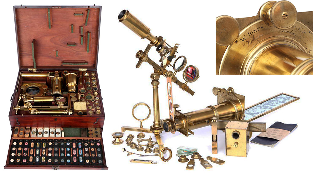 A ca. 1840s microscope, marked “Jones, 30 Holborn, London” on the base. Adapted for nonprofit, educational purposes from an internet auction site.