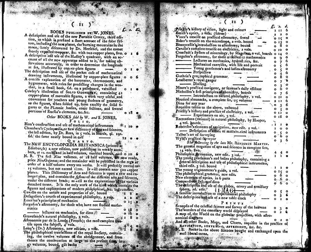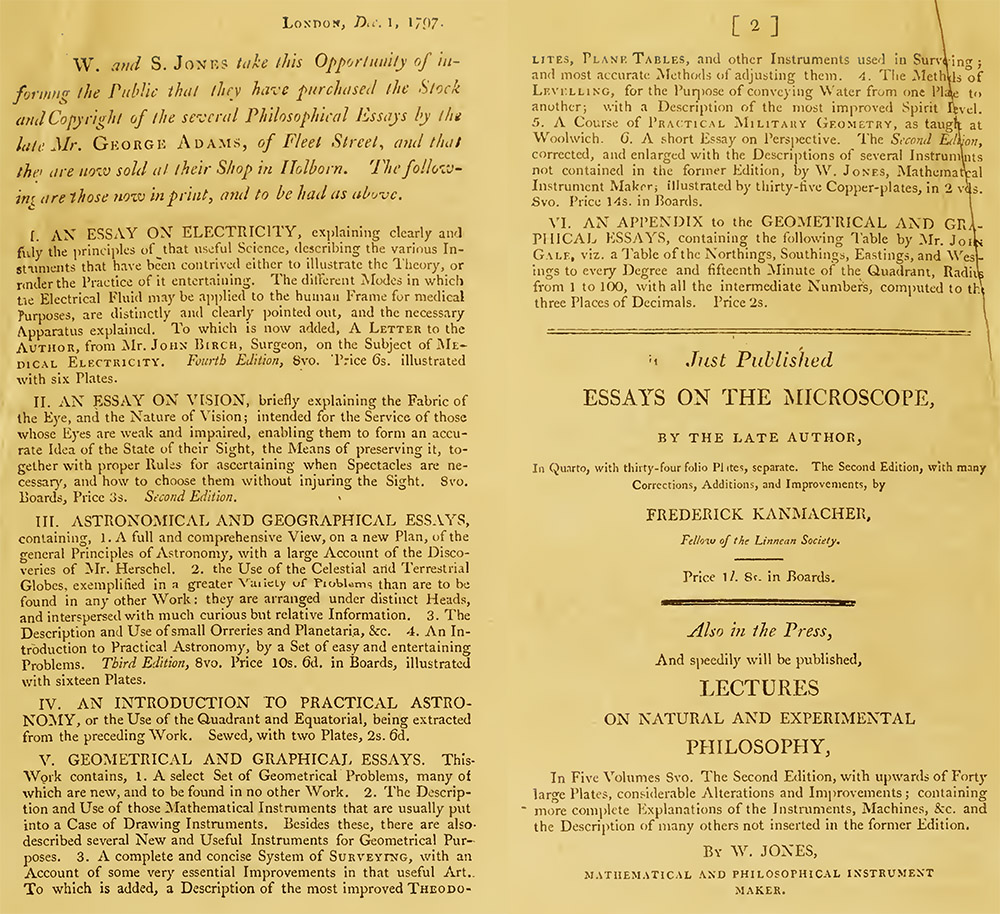 Two pages from W. & S. Jones’ catalogue that was included in their 1798 edition of Adams’ “Essays on the Microscope”. They note that they “have purchased the stock and copyright of several philosophical essays by the late Mr. George Adams … and that they are now sold at their shop in Holborn”. Listed works were, “An Essay on Electricity”, “An Essay on Vision”, Astronomical and Geographical Essays”, An Introduction to Practical Astronomy”, Geometrical and Graphical essays”, “An Appendix to the Geometrical and Graphical Essays”, and “Lectures on Natural and Experimental Philosophy”.