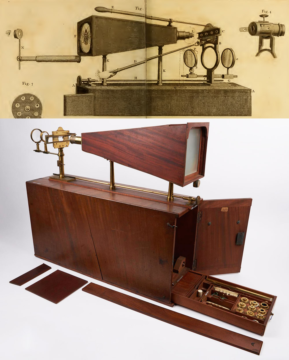 “Jones improved lucernal microscope”. Top, as illustrated in George Adams Jr’s 1798 “Essays on the Microscope”. Bottom, a surviving microscope. Image adapted for nonprofit, educational purposes from https://collection.sciencemuseum.org.uk/objects/co8712/lucernal-microscope-c-1795-by-w-s-jones-60-holbo.