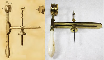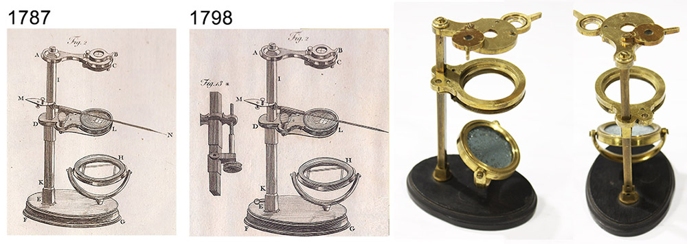 (Center) Illustration from the 1798 edition of Adams’ “Essays on the Microscope”, published by W. and S. Jones, where it was described as “Jones Universal Pocket Microscope”.