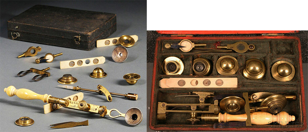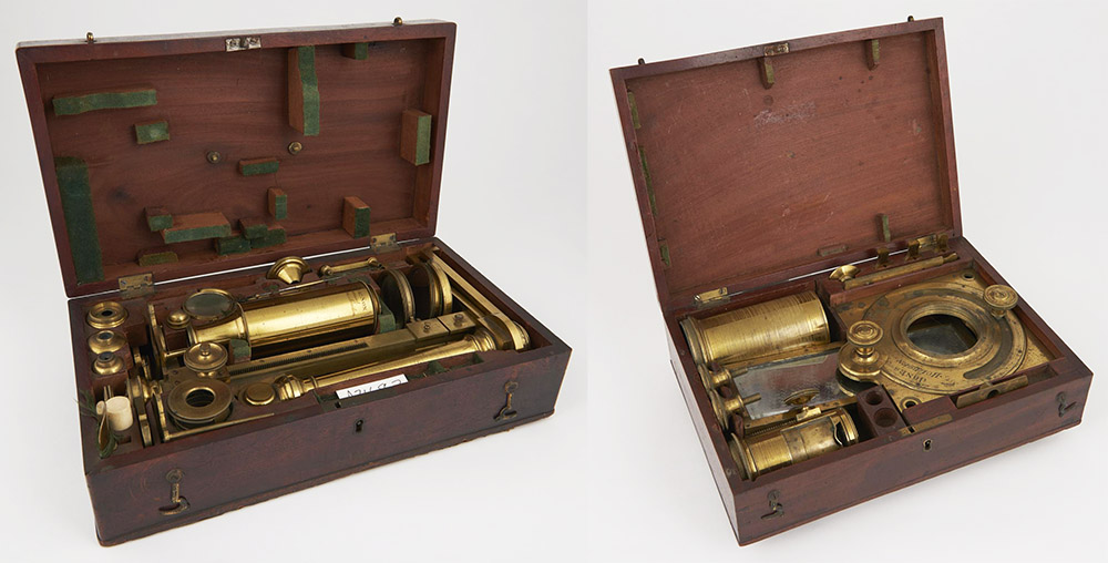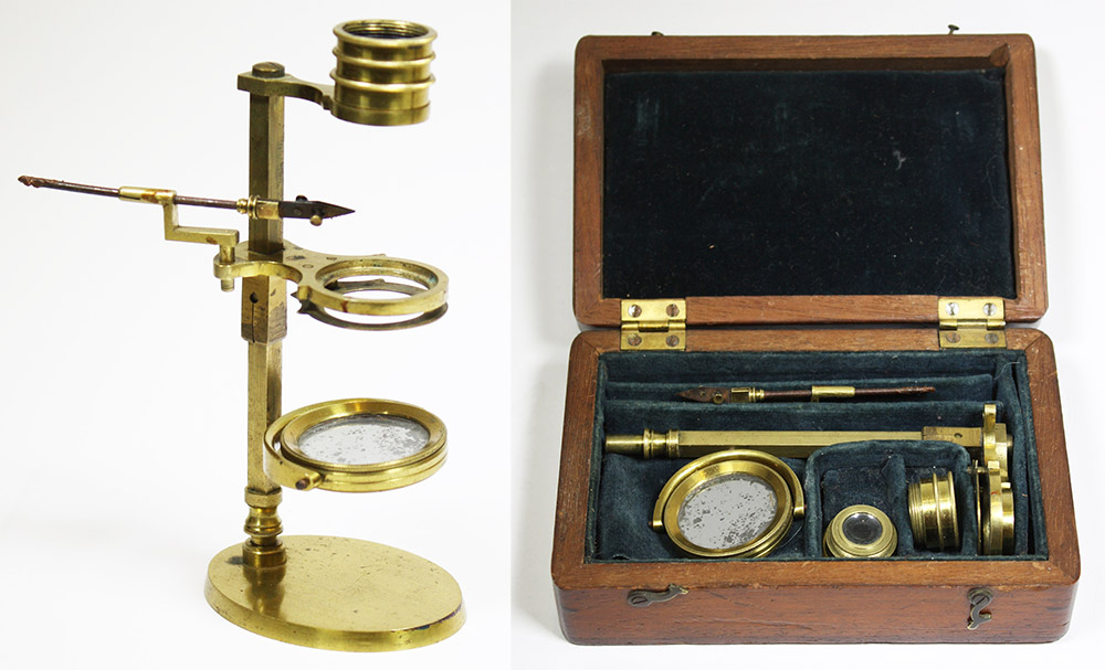 Cased microscopes that are signed “Jones and Son”. Left, described as the “new improved universal microscope” in the 1787 catalogue (Figure 8, above). Right, a solar microscope. Images adapted for nonprofit, educational purposes from https://collection.sciencemuseumgroup.org.uk/people/cp104399/j-jones-son.