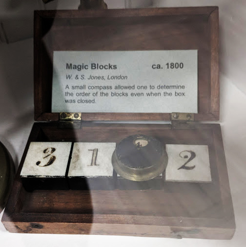 “A box containing 4 numbers and 4 letters, the order of which may be discovered, if ever so secretly placed, by means of a curious magic perspective”, which retailed for 10 s 6d in W. and S. Jones’ 1791 catalogue. Each block contains a piece of iron, each in a different corner. The “curious magic perspective” contains a rotating disc with four letters and numbers printed on either side, and an eccentrically-placed magnet. When the lid is closed, and the “curious magic perspective” is moved across the lid, the magnet rotates the disc as it passes over the iron in the hidden tiles. The appropriate letter or number appears in the window. Photographed from the scientific instrument collection of Transylvania University, Lexington, Kentucky.