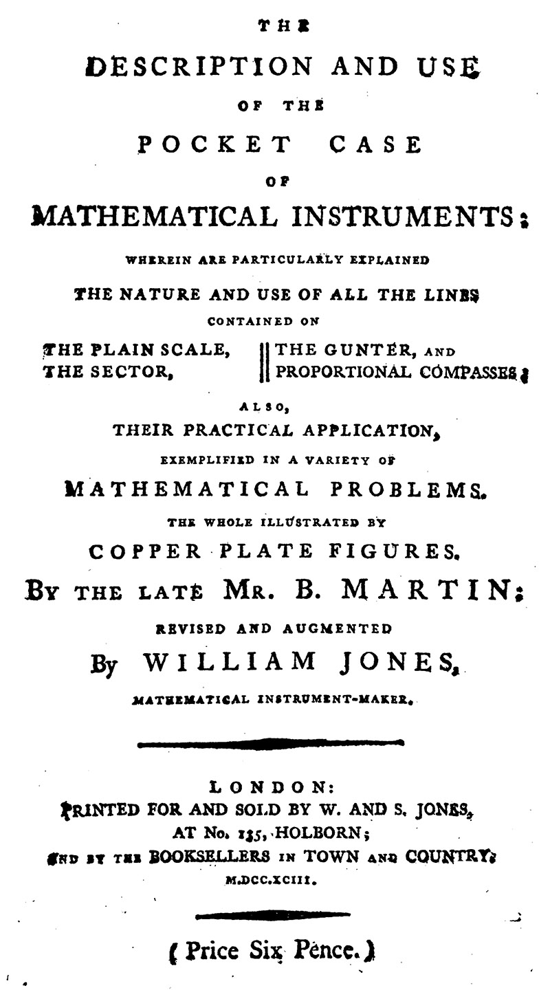 Title page of W. & S. Jones’ 1793 reprint of Benjamin Martin’s “The Description and Use of the Pocket Case of Mathematical Instruments”. This edition was “revised and augmented by William Jones, mathematical instrument-maker”. Listing both men’s names as authors would cause readers to associate Jones with Martin, a strategic marketing move.