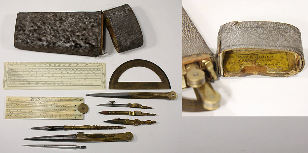 A pocket case of mathematical instruments. The shagreen-covered case is 7 inches / 13 cm long, and holds an ivory ruler, ivory and brass sector, protractor, dividers, and various interchangeable drawing/marking implements for the dividers. A label from w. & S. Jones is pasted inside the lid. The address on the label is 30 Holloway, to which the Jones moved in 1800.
