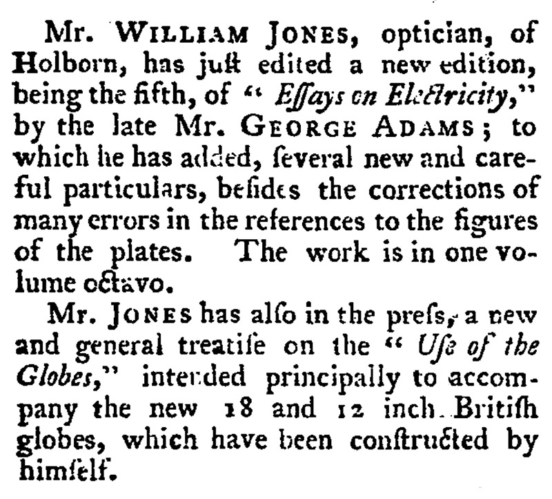 A 1799 announcement of Jones’ publication of Adams’ “Essays on Electricity” and William Jones’ “Use of the Globes”, and a note that W. and S. Jones was a manufacturer of globes. From “The Monthly Magazine”.
