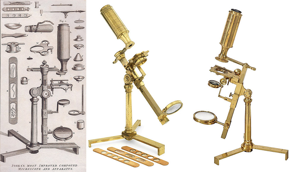 Jones “Most Improved” microscopes. Left, image from their 1798 edition of George Adams Jr.’s “Essays on the Microscope” - note that it was branded “Jones” in the illustration. Center and right, surviving examples, both signed by W. & S. Jones. It was described as the “new improved universal microscope” in the 1787 Jones and Son catalogue (see Figure 8). This model was a variant of Benjamin Martin’s “Universal” and George Adams Jr.’s “Improved Compound” microscopes. Images adapted for nonprofit, educational purposes from internet auction sites.