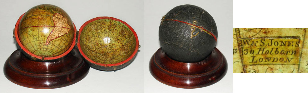 A globe by W. and S. Jones. The address indicates that it was manufactured after 1800 (see Figure 21). This is a pocket-sized globe, 2.75 inches in diameter, with celestial markings on the inside of the spherical case. Adapted for nonprofit, educational purposes from an internet retail site.