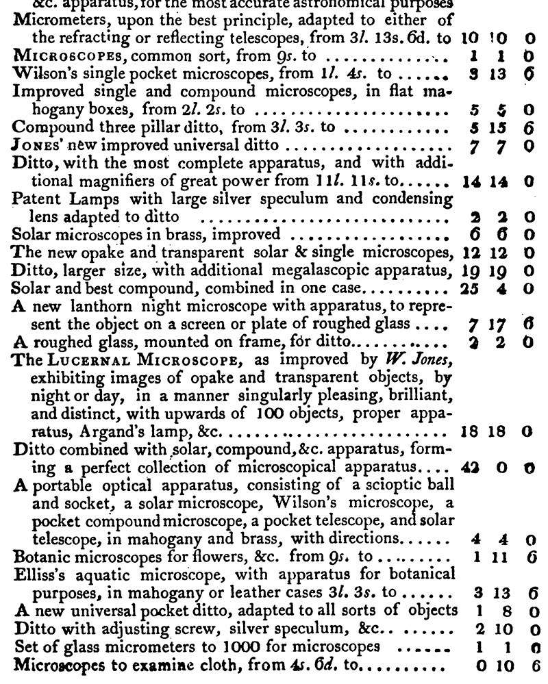Excerpt from an 1837 W. & S. Jones catalogue, showing the varieties of microscopes that they stocked at that time.
