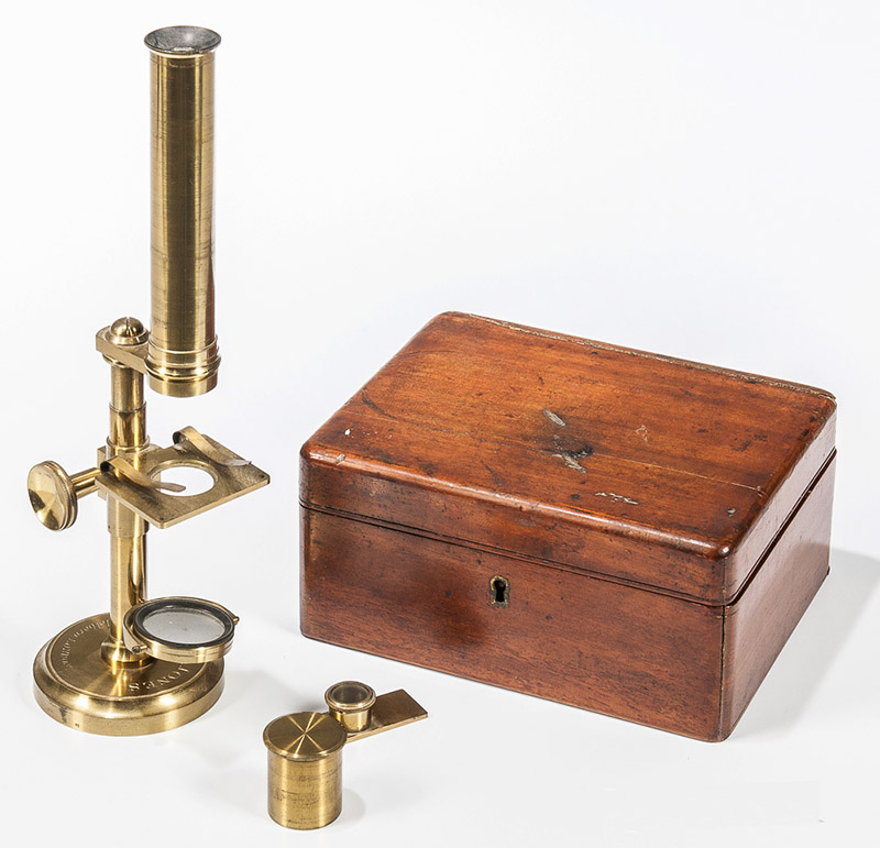 An unsigned microscope of a form that strongly resembles Jones’ “universal pocket microscope” (a.k.a. “Jones botanical”, Figure 3, above). Is this an example of the “new improved universal microscope” that W. and S. Jones advertised in 1837?