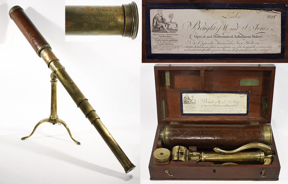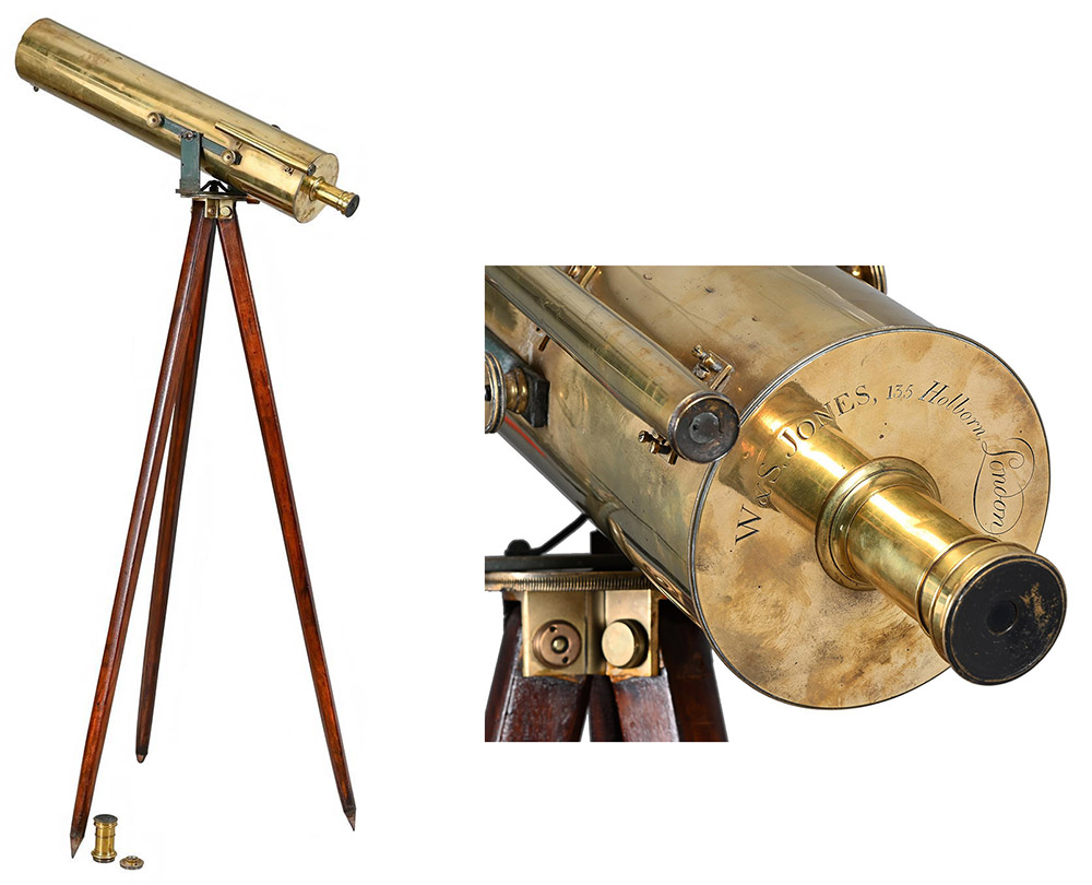 A 2 1/2inch refracting telescope by W. & S. Jones. The label bears the date 1825. Adapted for nonprofit, educational purposes from an internet auction site.