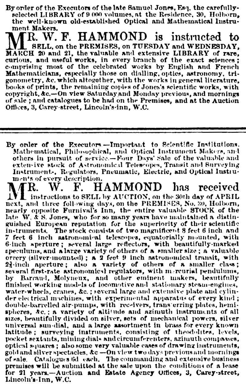 1860 advertisements for the auction of the personal belongings of Samuel Jones, and the stock of W. & S. Jones. From “The Builder”, March 17 and 31 issues.
