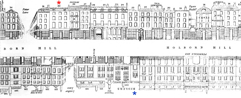 Illustrations from "Tallis’ London Street Views" of the buildings on Holborn Hill, 1838. W. & S. Jones’ shop was at number 30, near the corner of Fetter Lane (marked with a red asterisk). Their shop until 1800 was across the road, at number 135; when this image was produced, that building had been incorporated into The Bell and Crown Hotel (marked with a blue asterisk). It is adjacent to Furnival’s Inn, which the Jones frequently noted in their advertisements.