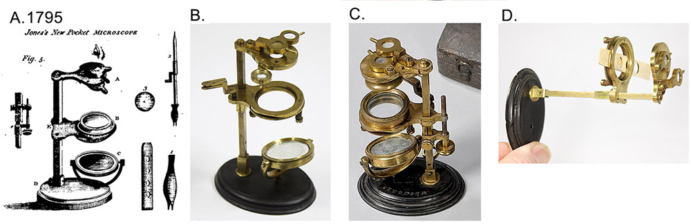 (C) The complex form of Jones’ universal pocket microscope, which includes a vertical thumbscrew fine focus. This option is noted in the 1798 and 1795 illustrations (Figure 3A and Figure 3B-A). This form is usually found with W. & S. Jones' signature.