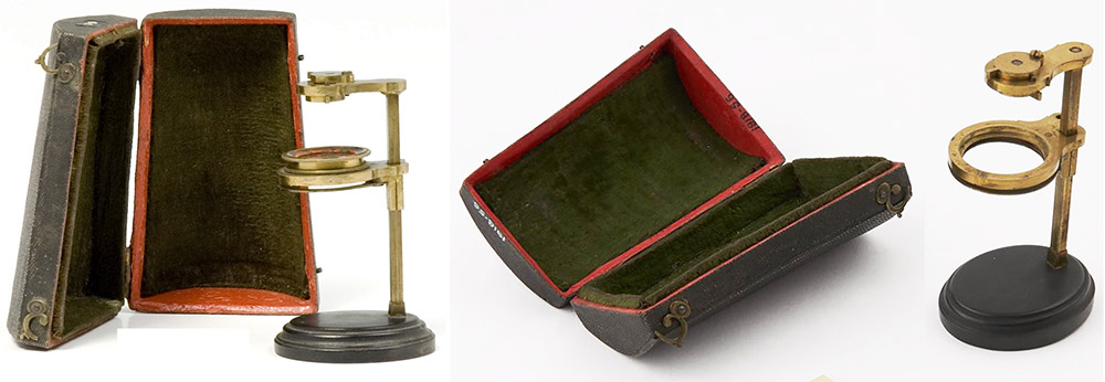 Folding “flower” microscopes are often attributed to W. and S. Jones, although they were produced by numerous manufacturers from the late 1700s until well into the 1800s. The left panel is an illustration of a “small pocket microscope for insects or flowers”, from Adams’ 1798 edition of “Essays on the Microscope”, published by W. and S. Jones.