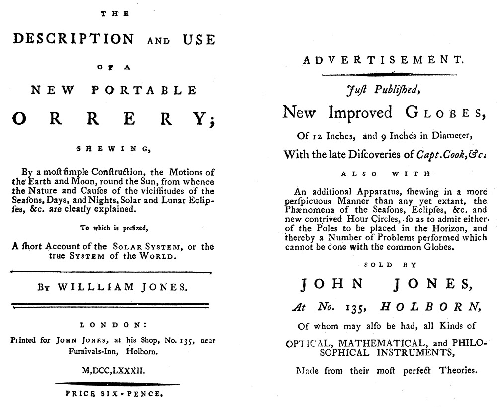 Excerpts from William Jones’ first edition of his book on his portable orrery (1782). Left, the title page, noting William as the sole author, and father John as the publisher. Right, an advertisement for globes and other apparatus that were available from John Jones’ shop.