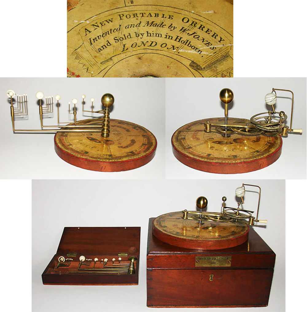 A portable orrery by William Jones, ca. 1784. Two sets of geared apparatus can be placed on the base, and cranked to orbit a brass sun: the planets Mercury through Saturn, with their known moons and rings (center, left), and Earth tilted on its axis, with a revolving moon (center, right). Images adapted for nonprofit, educational purposes from an internet sale site.