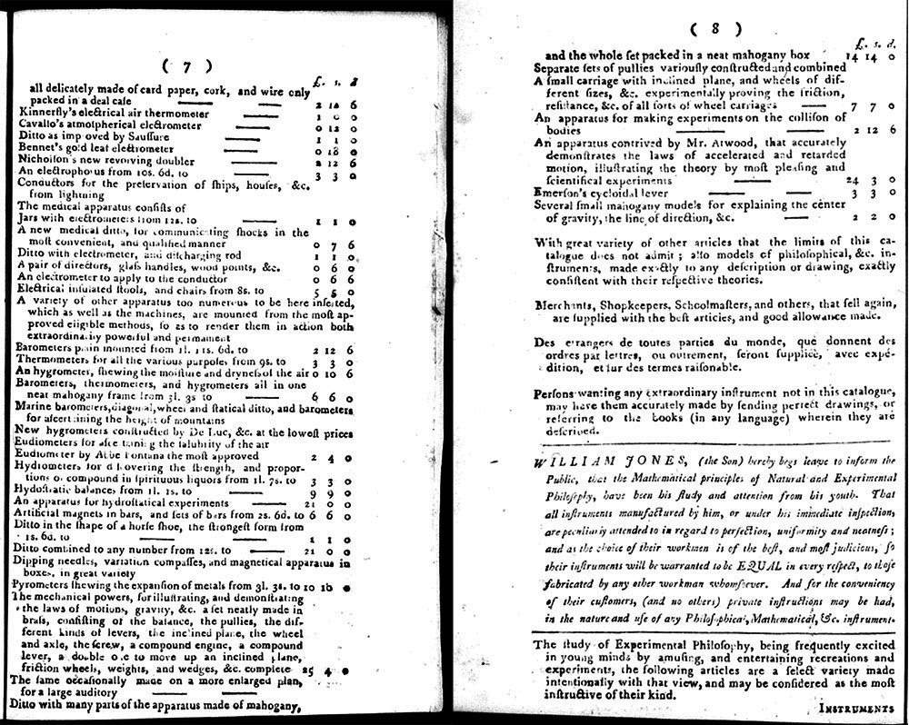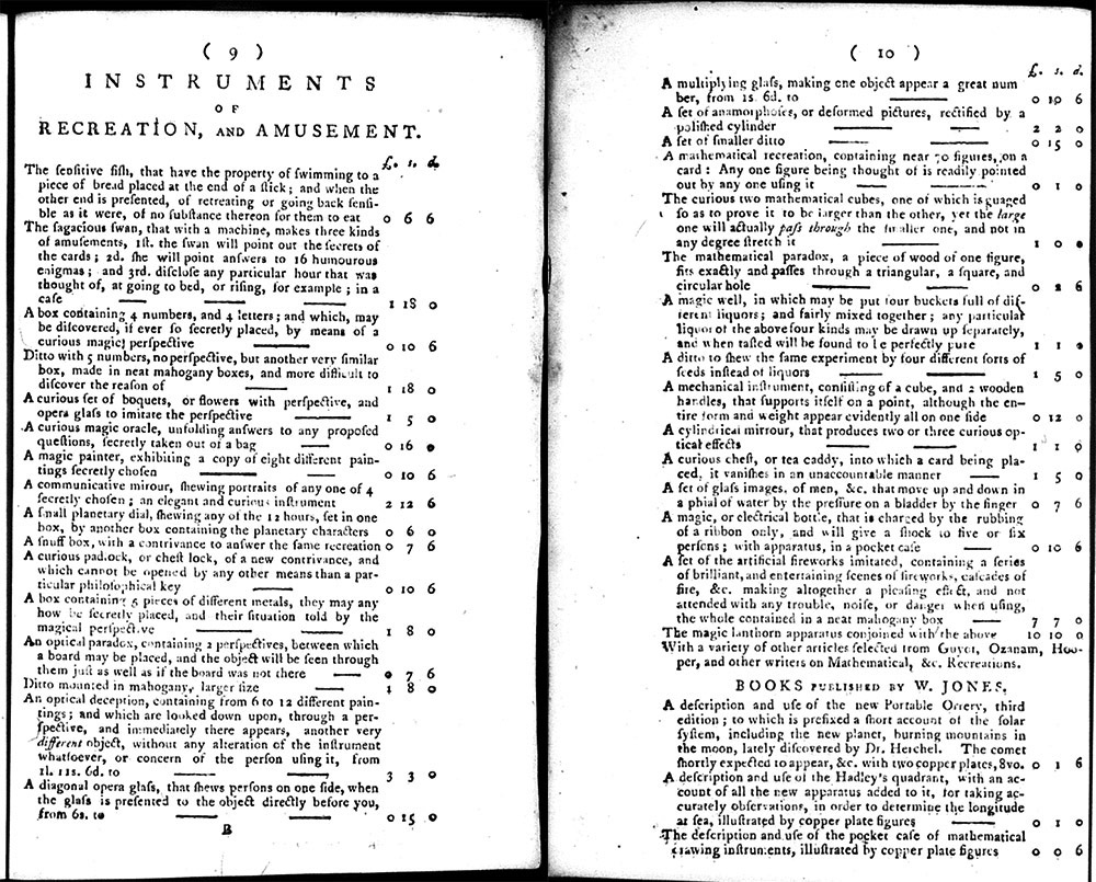 The 1791 catalogue of W. and S. Jones, the earliest known reference to the brothers’ partnership. In addition to nine pages of optical and scientific instruments, the catalogue lists two pages of novelties, “instruments of recreation and amusement”.