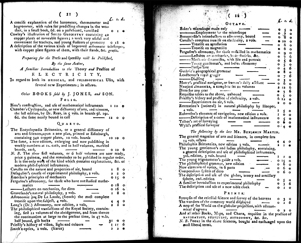 The first known catalogue from Jones and Son, 1787. It included numerous books that were published by William Jones, and books that were written by the late Benjamin Martin, the rights to which were owned by William Jones.