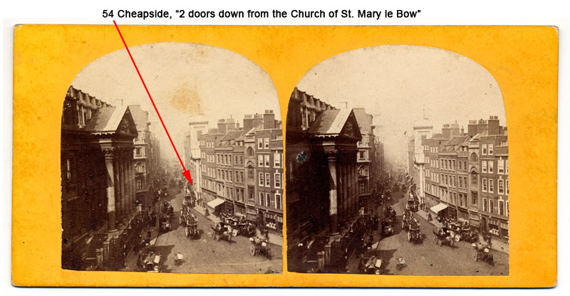 Top, a stereoview of Cheapside. LSC was located at number 54, which, in this view, is just before the Church of Saint Mary le Bow, on the right side of the road.