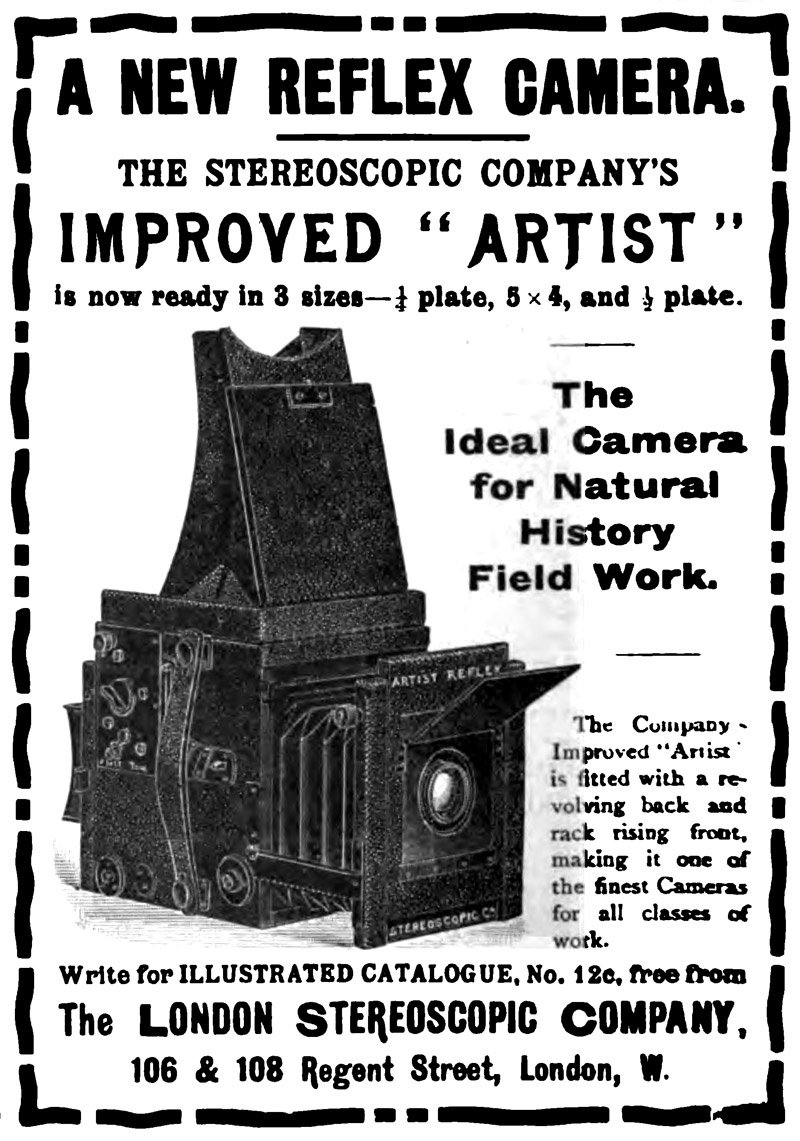 The International Annual of Anthony's Photographic Bulletin (1891) “Of hand cameras, the ‘Twin-Lens’ or double camera sold by the London Stereoscopic Co. deserves high praise. It includes two identical and rectilinear lenses; the upper one acting as a finder and showing an image on ground glass of the same dimensions as the plate employed. Moreover, the two lenses are focused together, so that as the operator focuses the picture on the ground glass (which he can see), he also focuses it on the surface of the sensitive plate (which he cannot see). This arrangement is excellent. The same firm's ‘Artist's Camera’ is a capital hand camera lower in price than the ‘Twin-Lens’. Another useful novelty sold by the company, is Mason's Lantern and Table Microscope. This is a comparatively cheap instrument, which will either give a brilliant image on the screen when used with the oxy-hydrogen lantern, or can be used for photo-micro work, or as an ordinary microscope”, Vol. 4, page 425